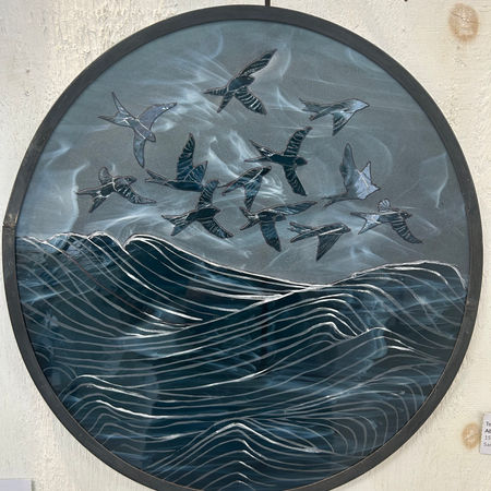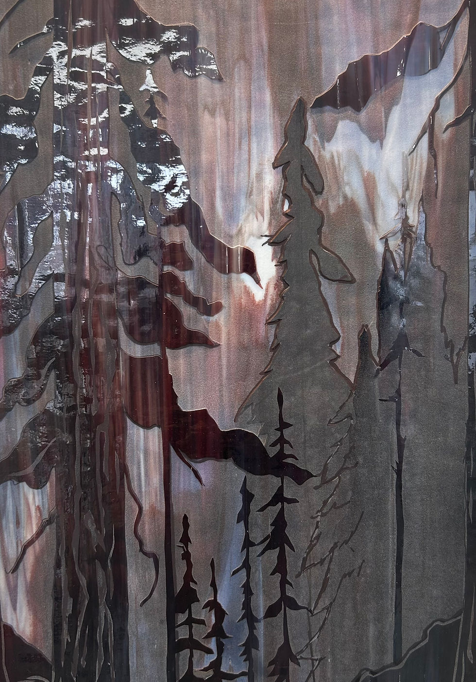 A passion and delight with anything glass is the one constant in Terese’s life. The technique, be it copper foil, lead, fusing or sandblasting, may change and evolve, but not the love of glass. Although stained glass will always be a part of her, the focus now is on sandblasting and sand carving on coloured art glass, with subjects ranging from the windswept pine trees of Georgian Bay, the skies of Georgian Bay, to the wildlife in her backyard.